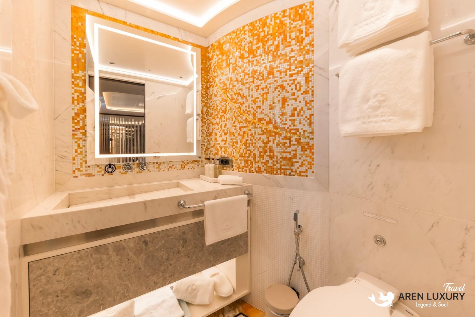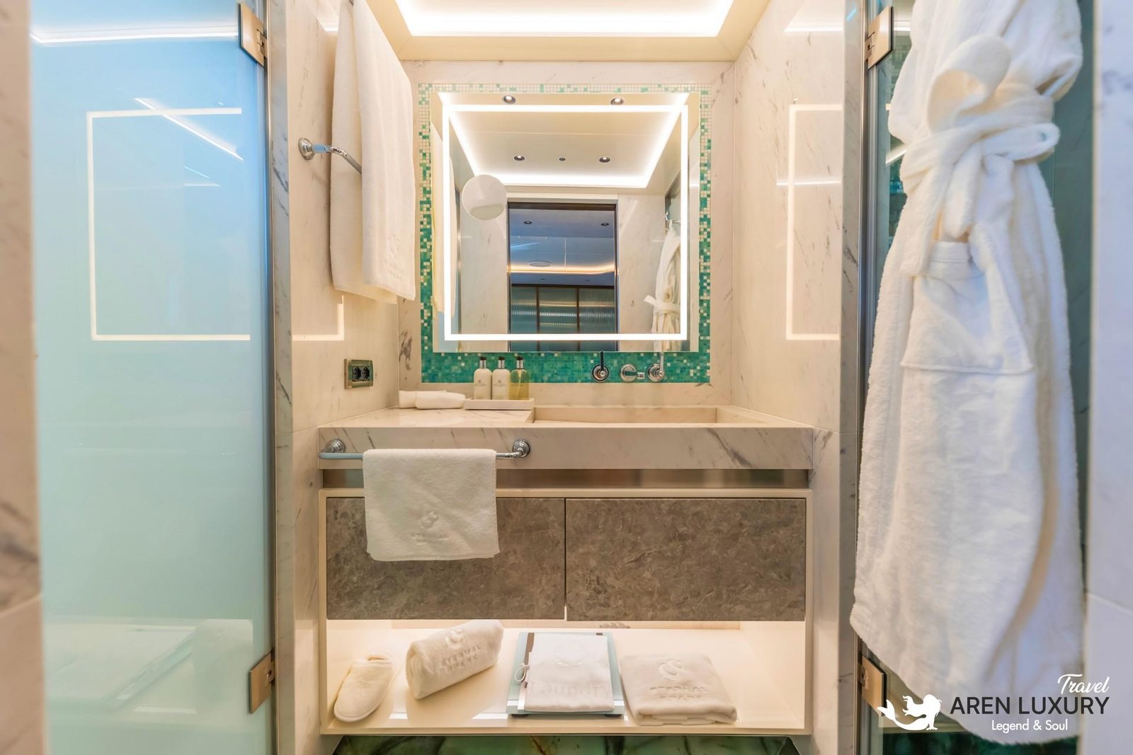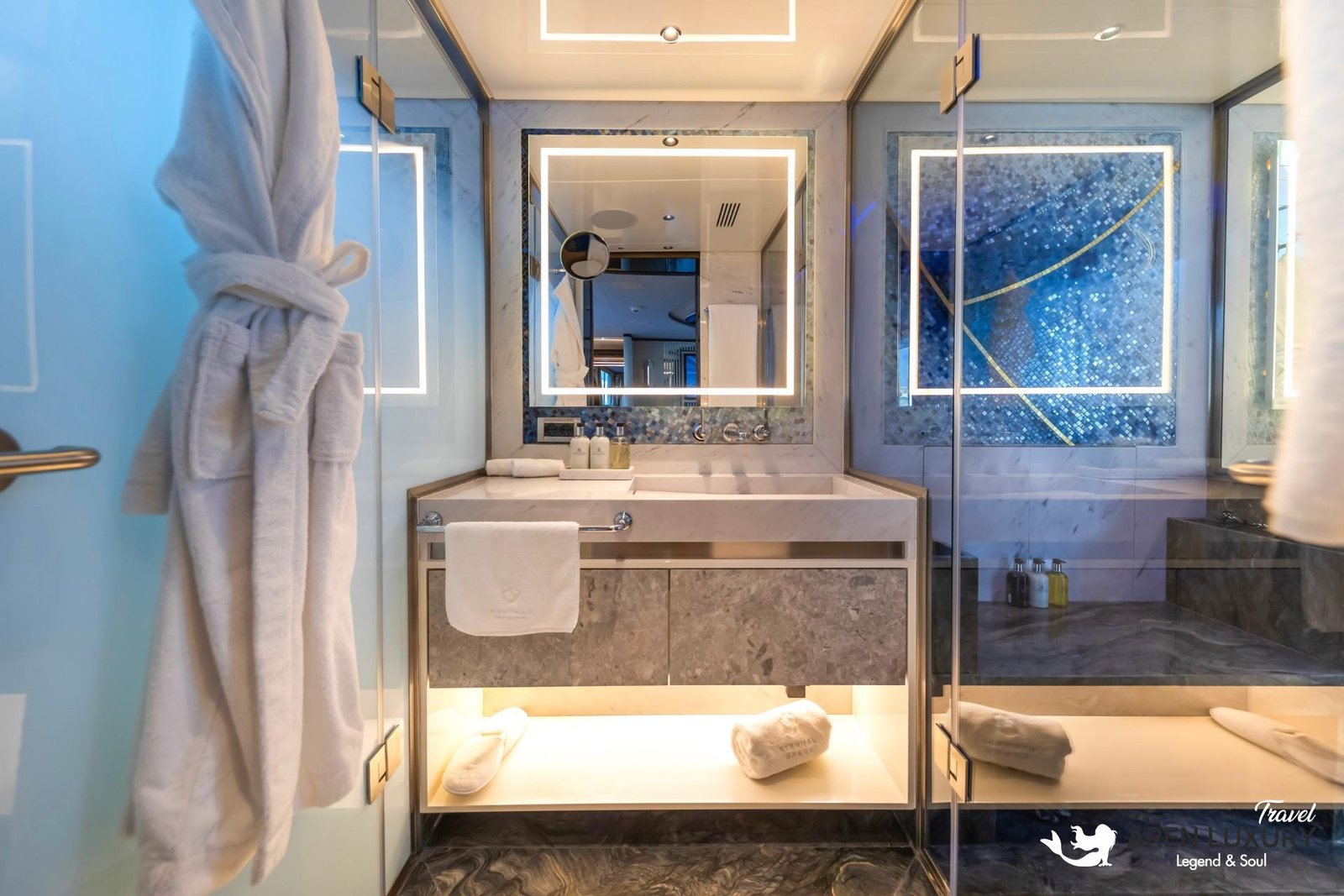 The VIP stateroom aboard Eternal Spark Yacht Charter is often referred to as the “second master suite” thanks to its exceptional size and design. This full-beam suite features a generous king-sized berth (220 x 210 cm) and bespoke accommodation elements, including a vanity table, a luxurious sofa, and a TV seamlessly embedded in the mirror in front of the berth. The suite’s elegant color palette of dark rose and burgundy extends across the upholstery, bedding, and artwork, while the en suite is adorned with striking red marble, perfectly complementing the overall design. Every detail has been carefully curated to provide guests with an extraordinary level of comfort and style.