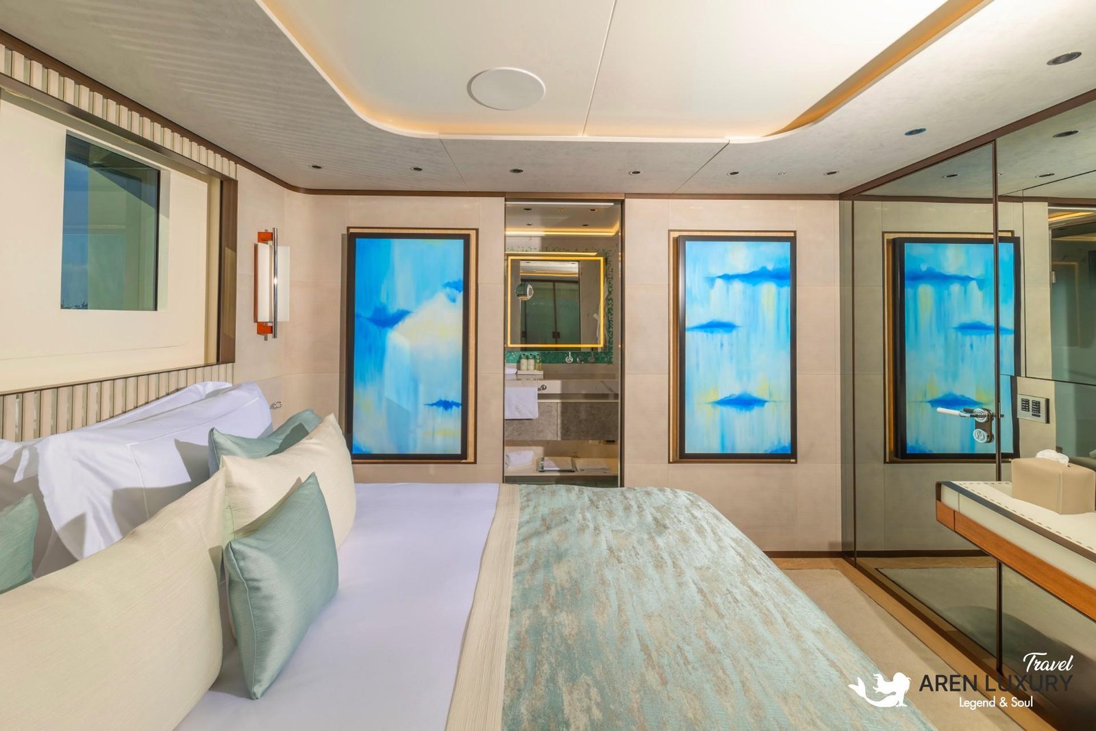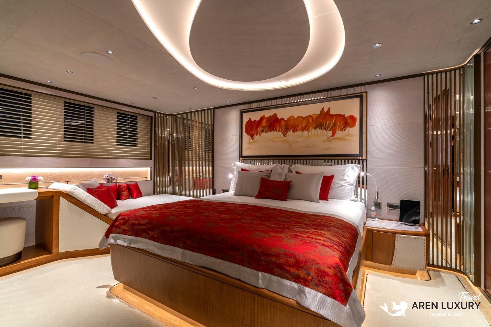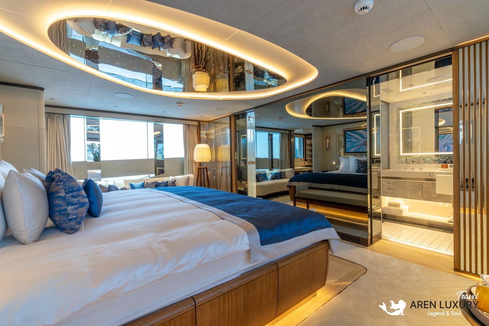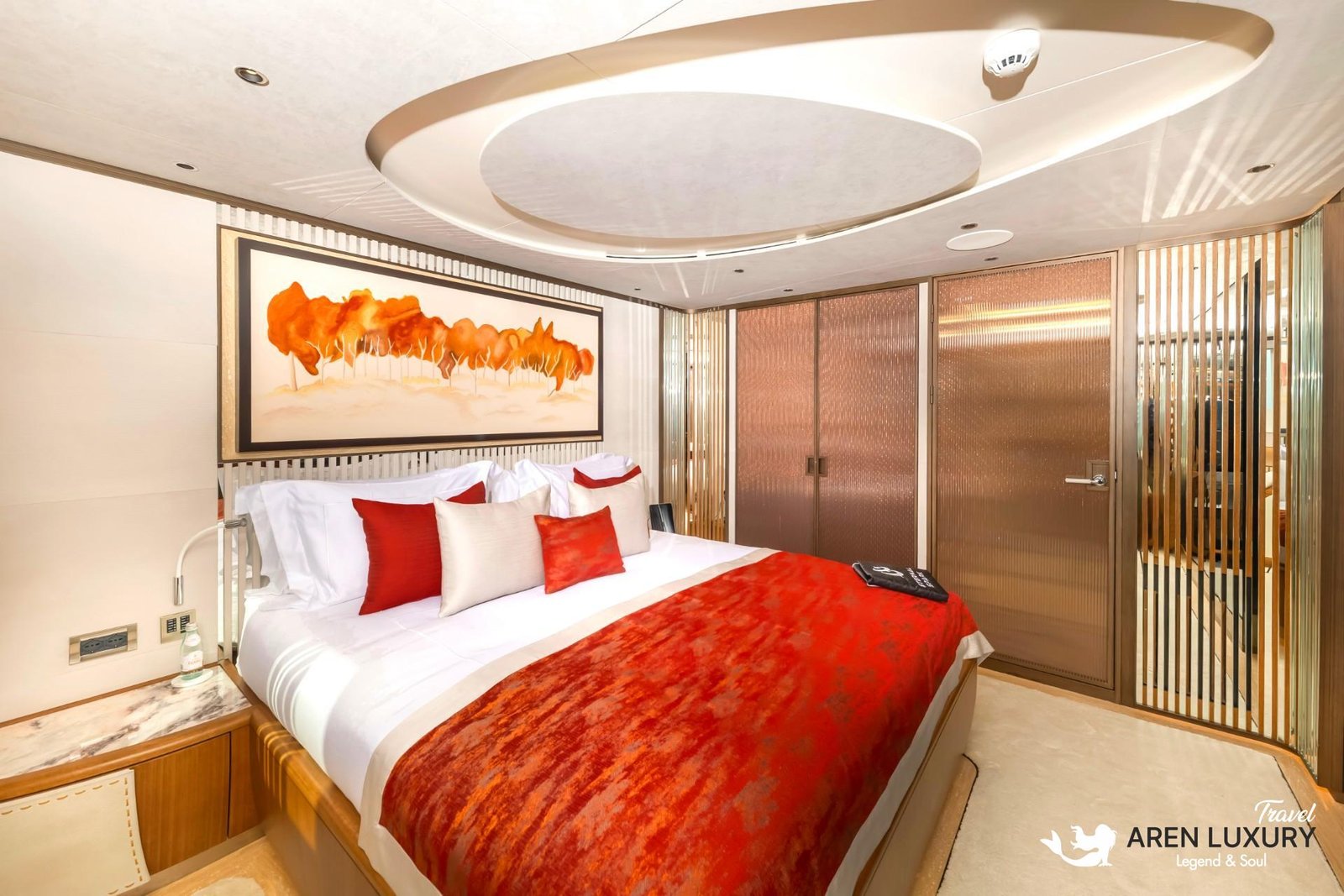 Eternal Spark Yacht Charter – Main Deck Master Cabin with Private Steam Room and Extra-Large King Bed.