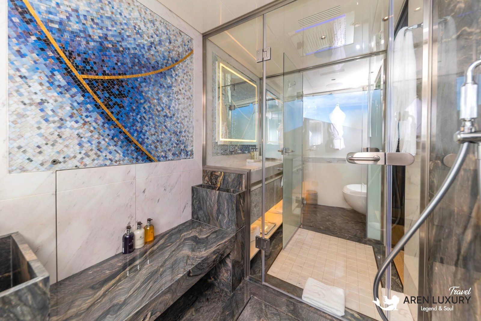 The master suite aboard Eternal Spark Yacht Charter offers unparalleled luxury and comfort. Designed with a classic layout, the suite features a spacious study/office area occupying the central part of the cabin. The suite is thoughtfully divided into two sections: the starboard side serves as “his” area, including his portion of the central bathroom, while the port side serves as “her” area, complete with a full-height walk-in wardrobe, vanity table, and a luxurious sofa. The centerpiece of the master suite is the enormous king-sized berth (240 x 220 cm), a truly unique feature for a 50-meter yacht, providing guests with an extraordinary sleeping experience.