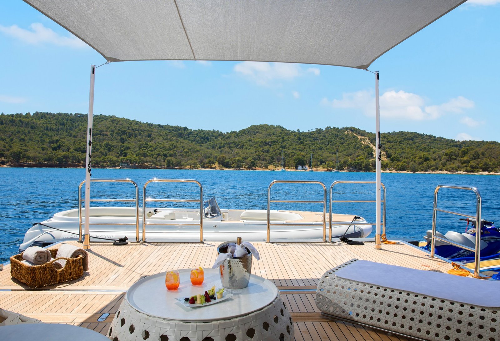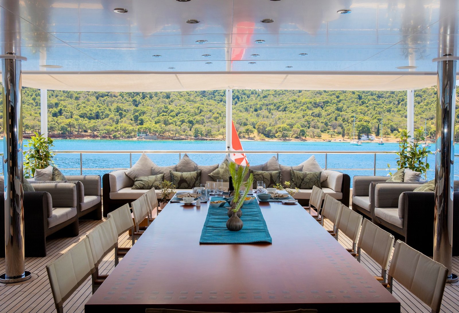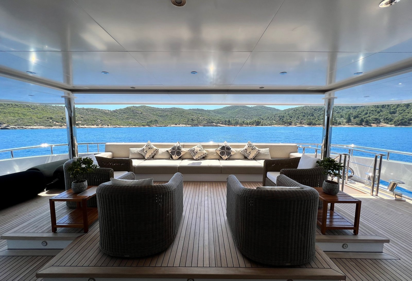 Persefoni I features expansive indoor and outdoor living areas, ideal for socializing, dining, and relaxation while on charter.